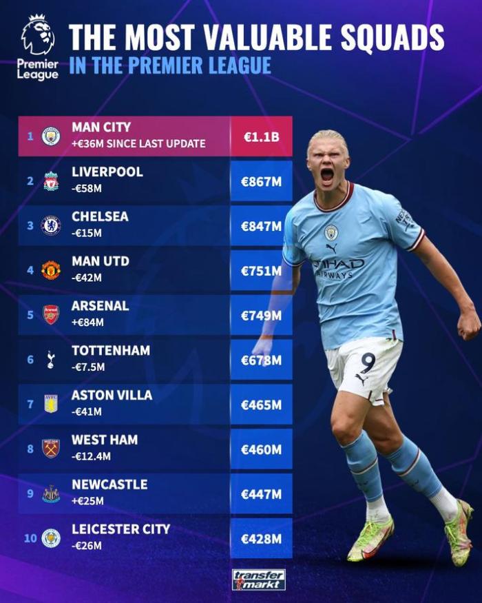 JRS直播网11月04日讯 消息,德国转会市场更新了英超球队最新身价榜,曼城上涨3600万欧,以11亿欧居首。