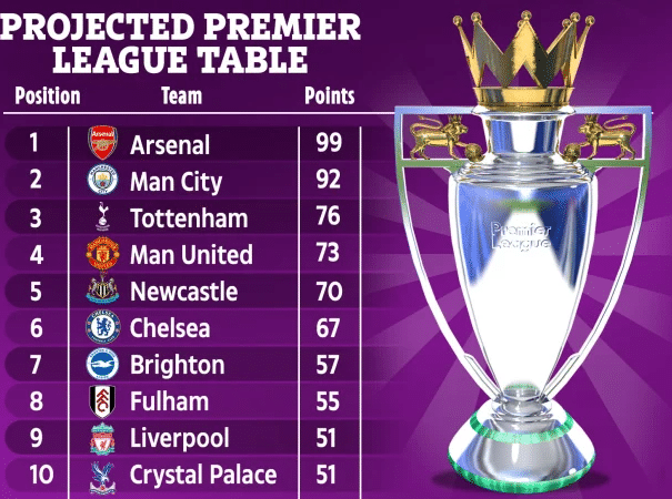 据预测,枪手本赛季将以99分夺冠,创下他们的英超夺冠积分纪录。曼城将积92分,获得亚军。