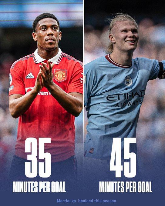 ESPN统计表明,本赛季至今,哈兰德平均每45分钟打进一起球,而马夏尔平均每35分钟就能打进一球。