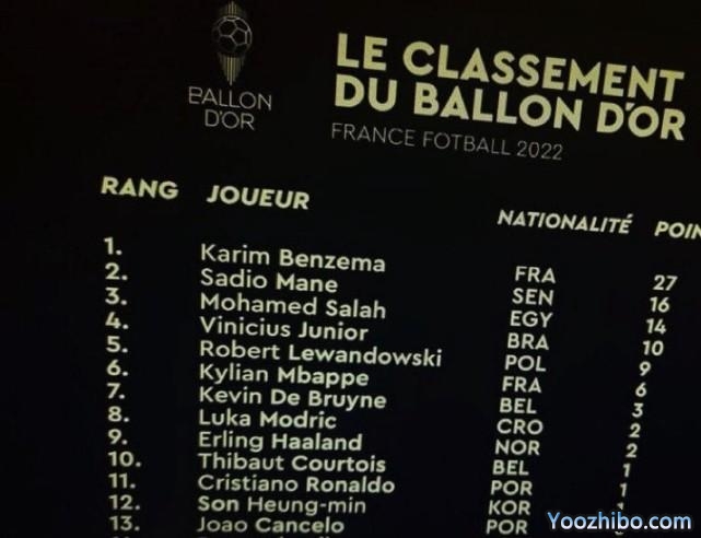 尽管距离本年度金球奖结果揭晓还有2周多的时间,但已经有投票结果在网上流出。在这份曝光的版本中,皇马射手本泽马毫无悬念当选,分数为27分。今夏转会拜仁的马内排名第2,分数为16分。而他的利物浦前队友萨拉赫,则以14分排名第3。