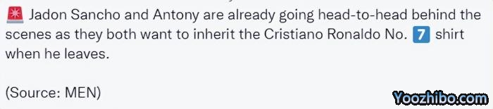 尽管如此,曼联商业部门仍然对7号球衣归属非常在意,希望未来能有一名既有球技又有商业价值,能卖出大量球衣的明星球员,能够替代C罗的位置。37岁的葡萄牙巨星明夏肯定会离开,这已经是确定无疑的结局,而目前,新7号有两个主要候选人——英格兰国脚桑乔和巴西边锋安东尼。