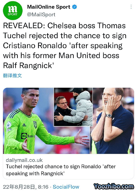 切尔西是被传很有可能得到C罗的,他们的中锋位置确实需要补强,在窗口关闭前被认为很有可能带来C罗。但根据最新的消息显示,切尔西已经关闭了对于C罗的交易,这是《每日邮报》的消息显示:“图赫尔在和前曼联主帅朗尼克交流后,拒绝了签下C罗的机会。 ”