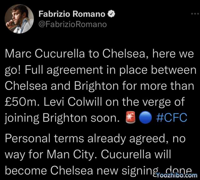 JRS直播网08月04日讯 ,来自知名转会专家罗马诺的最新消息,英超豪门切尔西俱乐部就西班牙左后卫库库雷利亚的转会,和布莱顿俱乐部达成协议,蓝军也与球员谈妥合同,后者将在周四抵达伦敦接受体检。双方将签约至6年,至2028年。