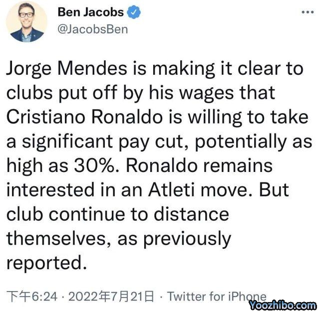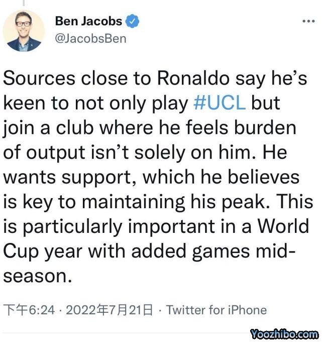 JRS直播网07月22日讯 凌晨, CBS Sport体育记者Ben Jacobs介绍了关于葡萄牙巨星C罗未来去向的最新情况。据C罗身边消息人士透露,在明确今夏离开曼联后,C罗对于自己的下家也提出了要求。
