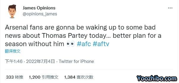 JRS直播网07月05日讯 《电讯报》今日爆料称,一位英超球员因涉嫌强奸在北伦敦被捕,而有球迷发现,在消息出来的10个小时前,有一名推特用户表示阿森纳本赛季将没有中场托马斯-帕特耶可用。