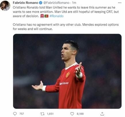 JRS直播网07月03日讯 在《泰晤士报》率先曝光C罗希望今夏离开曼联后,北京时间7月3日凌晨,知名转会专家罗马诺也证实了C罗确实想走。罗马诺表示,C罗想看到曼联展现更大的野望,但现状却让人很失望。