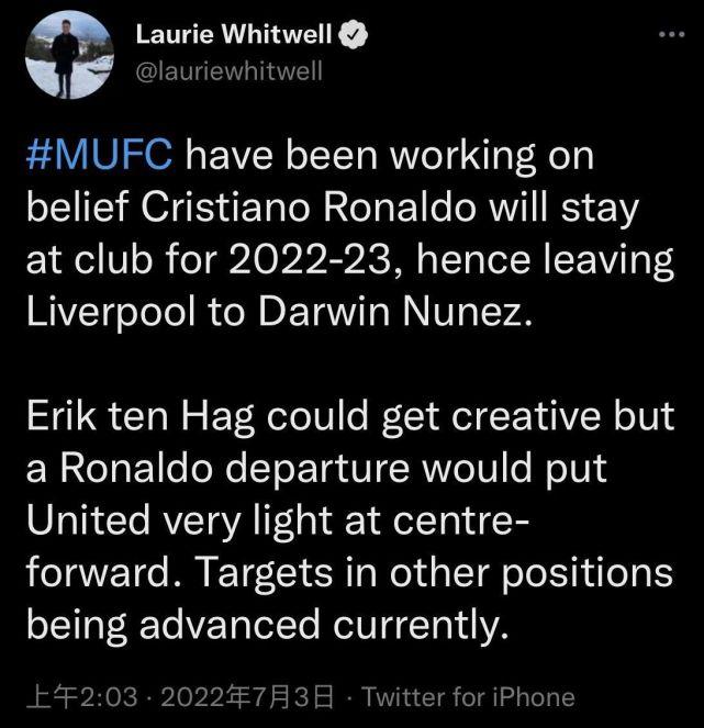 英媒透露,曼联高层此前一直都坚信C罗今夏会留队。正因为此,他们才放弃与利物浦争夺乌拉圭神锋努涅斯。此前,努涅斯一直都是曼联新帅滕哈格钦点的引援目标。但努涅斯的到来必将对C罗的主力位置发起强力冲击,为了照顾C罗的情绪,曼联放弃了竞购努涅斯。后者最终以总价1亿欧元转会费,登陆安菲尔德球场。