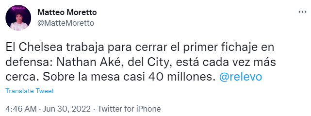 JRS直播网06月30日讯 Relevo记者马特奥-莫雷托报道,切尔西为曼城后卫阿克报价4000万欧元,已接近签下他。