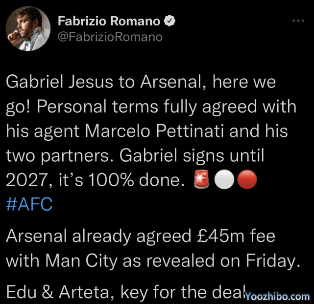 JRS直播网06月27日讯 日凌晨,知名转会专家罗马诺在个人社交账号上确认,巴西射手热苏斯的经纪人已经与阿森纳俱乐部达成协议。双方将签约5年至2027年。而热苏斯也将成为继马尔基尼奥斯和法比奥-维埃拉之后,阿森纳夏窗的第三位新援。