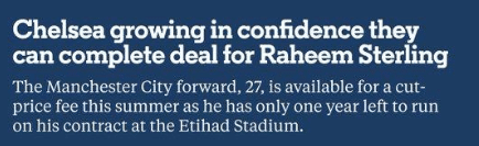 斯特林与曼城的合同将在2023年到期,目前他仍未续约,切尔西方面已开出3500万英镑的报价,但曼城为球员标价6000万英镑,两队需要继续就转会费进行谈判。