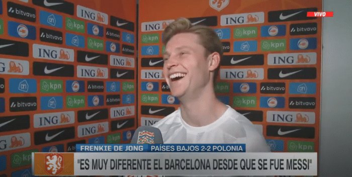 在周六晚代表荷兰队2-2战平波兰的欧国联比赛后,巴萨中场德容也被问到加盟曼联的可能性。ESPN记者询问25岁的德容:「你是不是将离开巴塞罗那的沙滩,前往寒冷的曼彻斯特?」德容哈哈大笑:「不,我想,我什么都不能说。」