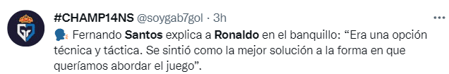 桑托斯说道:“C罗不存在管理问题,在我看来,今天的人员安排对这场比赛来说是最好的解决方案。这是一个战术决定,我们相信他能在下半场登场并改变比赛。”
