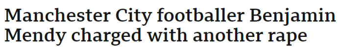 JRS直播网06月02日讯 据BBC报道,曼城后卫本杰明-门迪被指控犯有另一项强奸罪,现在他被指控对7名女性实施8次强奸、1次性侵和1次强奸未遂。