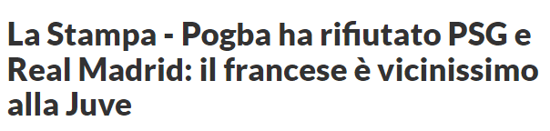 《新闻报》透露,为了返回斑马军团,博格巴甚至拒绝了皇马和巴黎的报价。未来几个小时,博格巴可能就会与尤文达成协议。