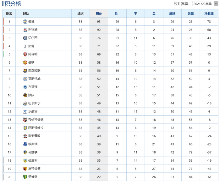 其余比赛中,热刺5比0大胜,孙兴慜梅开二度,他和萨拉赫并列拿到金靴,热刺也拿到了欧冠参赛资格。阿森纳最后一场是5比1大胜,但还是只能排名第5位,参加欧联杯的比赛。曼联0比1输给水晶宫,他们幸运守住第6的位置,下赛季可以参加欧联杯的比赛。