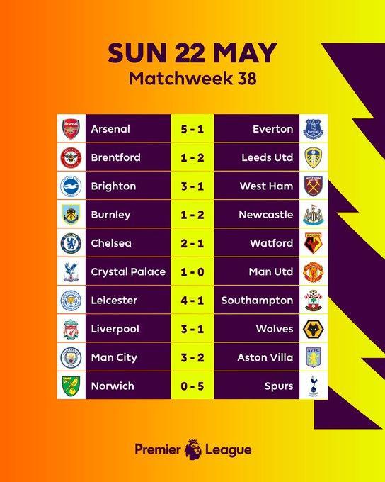 JRS直播网05月23日讯 英超第38轮,曼城3-2维拉,利物浦3-1狼队,切尔西2-1沃特福德,阿森纳5-1埃弗顿,热刺5-0诺维奇,传统六巨头里只有曼联0-1输给了水晶宫。