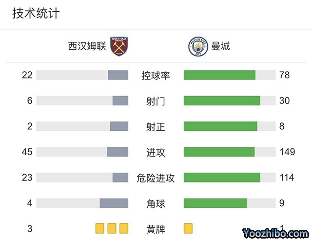全场比赛结束,曼城2-2战平西汉姆,多赛一场领先利物浦4分。