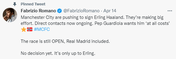 目前曼城和皇马在争夺哈兰德,蓝月亮正全力以赴。哈兰德的未来取决于球员自己,目前他还没有做出决定。