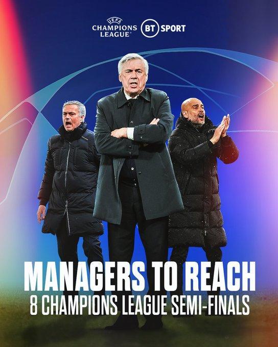 现在,安帅已经追平穆里尼奥和瓜迪奥拉,并列成为进入欧冠半决赛次数最多的教练。