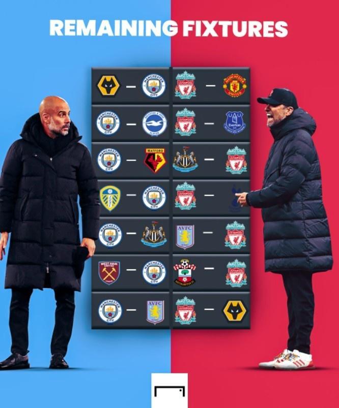 在两队剩余的7轮联赛中,曼城无需面对六巨头球队,而利物浦则需要迎战曼联和热刺。
