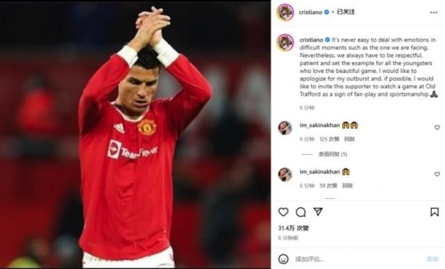 C罗写道:“困难时刻面对情绪管理总是很难的,就像这次我们面对的。不管怎样,我们必须总是保存尊重、耐心,并为所有热爱比赛的年轻人树立榜样。我想为我的爆发道歉,如果可能,我想邀请这位球迷来老特拉福德看比赛,以作为公平竞争和体育精神的象征。”