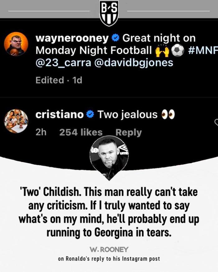 「Ballsack Sports」报道则宣称,鲁尼也回应了C罗的发言,称他无法接受批评。「两个幼稚的人。」鲁尼说,「他真的受不了任何批评。如果我真想说出内心的看法,他最后可能会哭着去找乔治娜。」