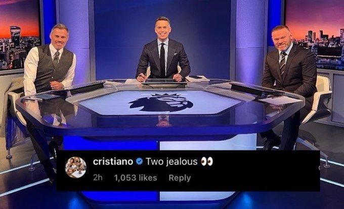 JRS直播网04月07日讯 鲁尼日前与卡拉格一同出席天空体育节目,随后鲁尼晒出两人合照,而C罗则在评论区表示两人“嫉妒自己”。