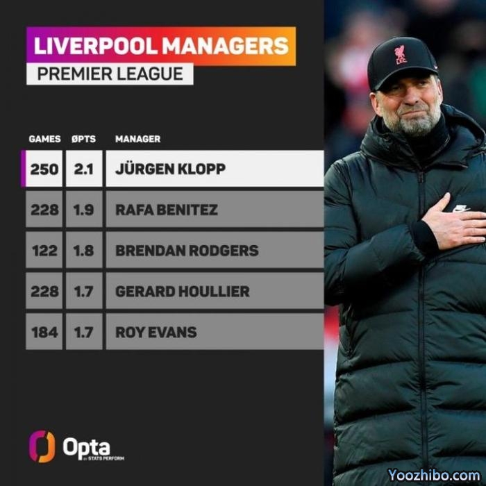 JRS直播网04月06日讯 据Opta统计,这是克洛普执教利物浦的250场英超比赛,每场比赛平均得分2.14分,是红军历史上所有主教练中得分最高的。