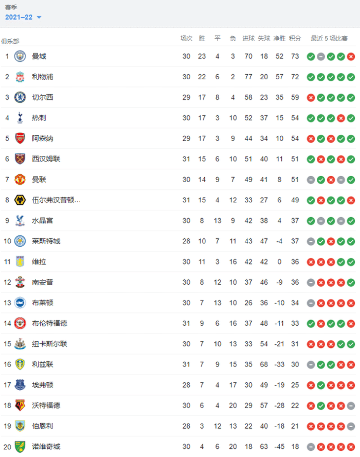 曼城30轮73分以1分的微弱优势领跑积分榜,利物浦72分紧随其后,切尔西本轮爆冷1-4不敌布伦特福德,少赛一轮59分排名第三,热刺则在大胜纽卡斯尔后30轮54分排名第四。