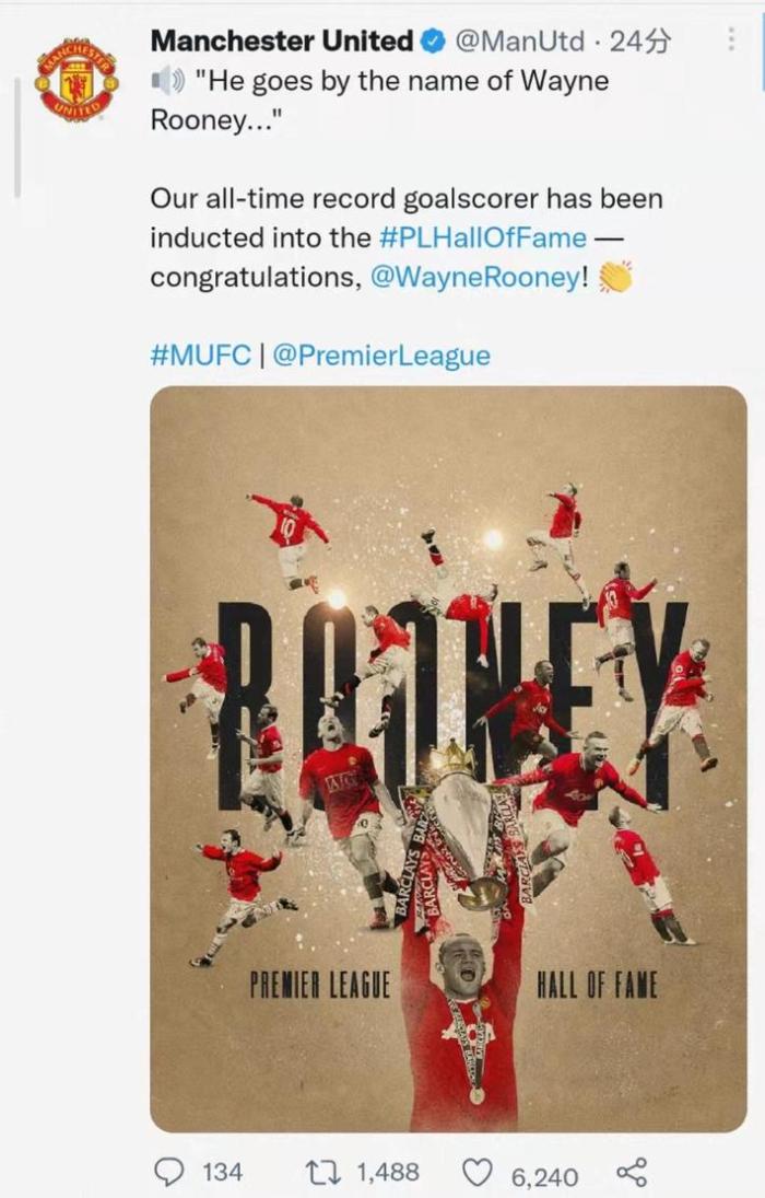 曼联写道:“他的名字叫做韦恩-鲁尼,我们的历史最佳射手已经入选了英超名人堂。祝贺韦恩-鲁尼!”