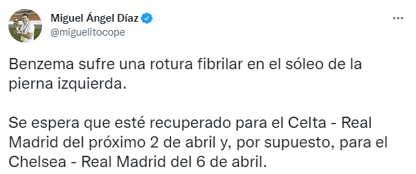 JRS直播网03月20日讯 科贝电台皇马记者MiguelÁngelDíaz消息,本泽马比目鱼肌撕裂,他是在对马洛卡时受伤的。