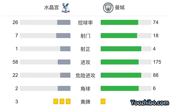 全场比赛结束,曼城客场0-0战平水晶宫。