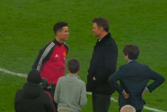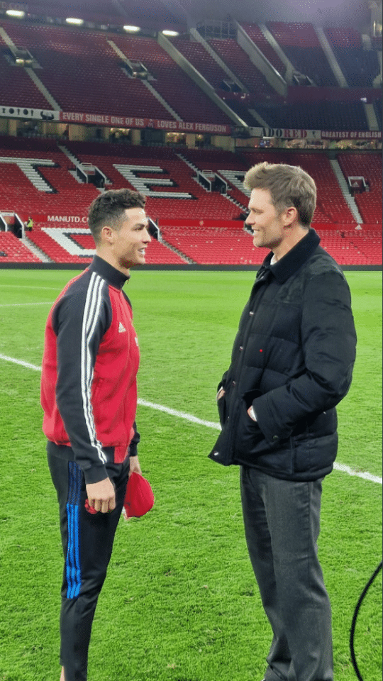 赛后,布雷迪也走下了看台,来到场边与赛后进行采访的C罗进行热聊。随性的C罗穿着曼联外套,穿着拖鞋手插兜与布雷迪侃侃而谈,两人谈笑风生了好长一段时间,聊到兴起时,双方还互相拍打肩膀,看起来交情不浅。随后,C罗还给布雷迪的儿子送上了礼物。