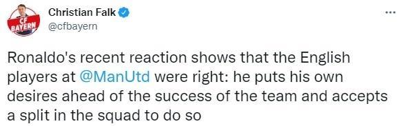 法尔克对此表示:“C罗最近的反应证明曼联的英格兰球员不满是对的,他把个人意愿凌驾于球队之上,哪怕球队因此分列他也接受。”