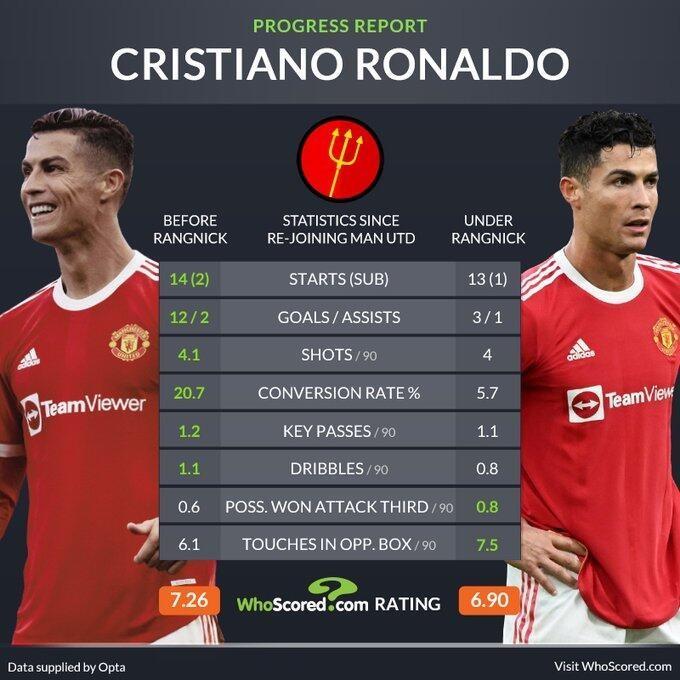 JRS直播网讯3月6日讯 WhoScored今天统计了朗尼克上任前后C罗的数据,并发现在朗尼克执教曼联后,C罗各项数据大幅下降。