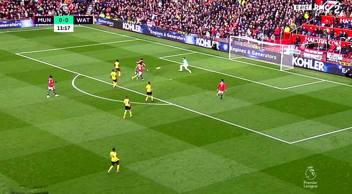 然而,更多的时候,曼联没有进球自身选择错误。尤其是第12分钟,埃兰加与C罗精彩配合,红魔撕破沃特福德防线,布鲁诺·费尔南德斯直接面对沃特福德门将本·福斯特,此时,他既可自己起脚,也能选择横传,因为身边的安东尼·埃兰加和远处的C罗都已各自跑位,而且都不越位!