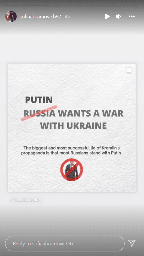 索菲亚-阿布拉莫维奇在INS上写道:“普京想和乌克兰开战,而不是俄罗斯。克里姆林宫宣传攻势中最大和最成功的谎言便是大多数俄罗斯人支持普京。”