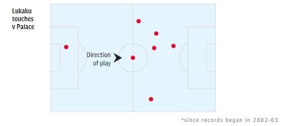 JRS直播网02月21日讯 在近期结束的一场比赛中,卢卡库在切尔西1-0水晶宫的比赛中创造了一项尴尬纪录,全场比赛仅触球7次,这也打破了此前的最低触球纪录,他成为了02/03赛季英超开始统计触球次数以来,单场比赛触球次数最少的球员。