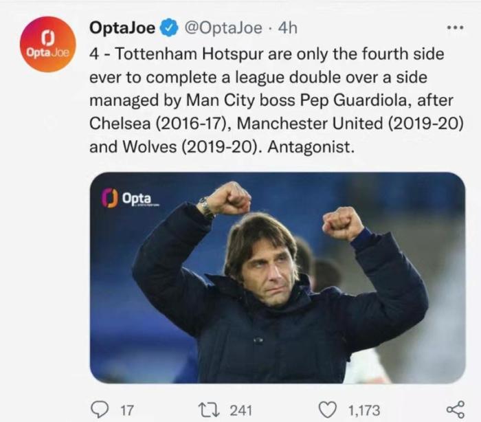 双杀!热刺是第4支在英超中双杀瓜氏曼城的球队