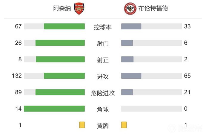 阿森纳2-1布伦特福德 史密斯罗低射破门萨卡建功