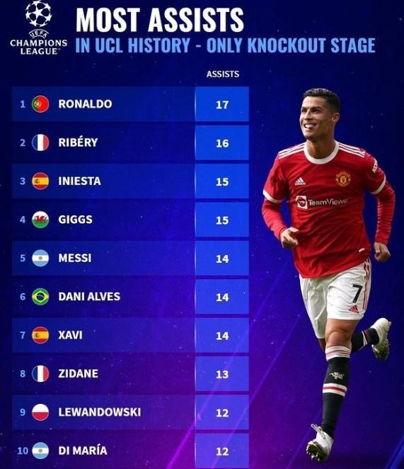 JRS直播网02月18日讯 德国转会市场今日统计了欧冠联赛淘汰赛历史助攻榜,C罗17次助攻排名第一。