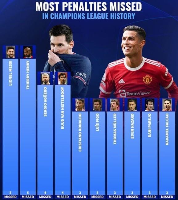 JRS直播网02月17日讯 德国转会市场今日统计了欧冠历史失点排行榜,梅西和亨利以5球排名第一。