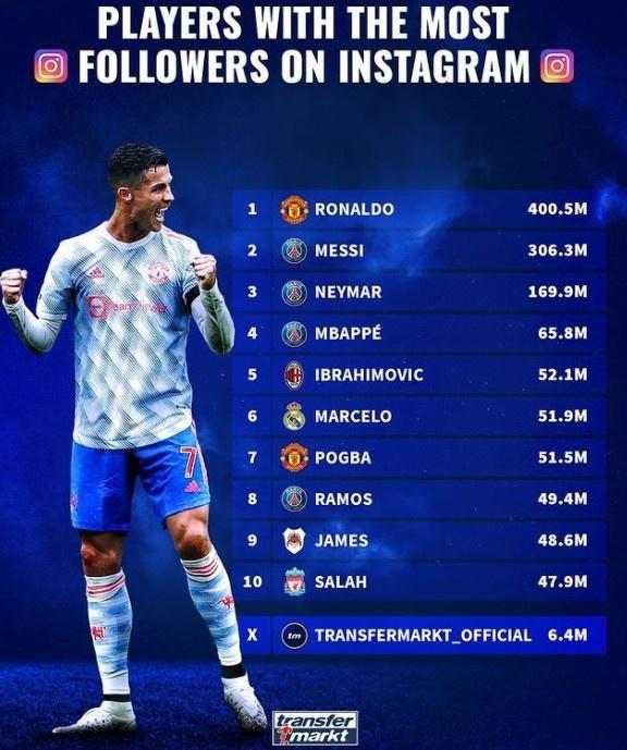 JRS直播网02月07日讯 德国转会市场网统计了足坛Instagram粉丝最多的球星,C罗4亿独自领跑,梅西3亿排名第二。