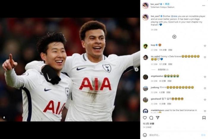 作为阿里的前队友,孙兴慜也在社交媒体上向阿里告别,他表示祝阿里在新的篇章一切顺利。