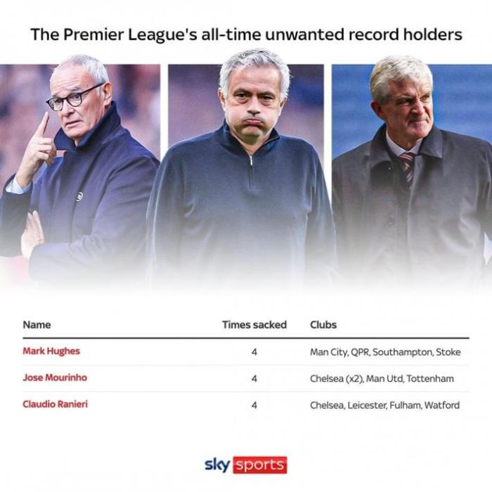 这三名教练曾4次在英超遭到解雇,其中马克-休斯被曼城、QPR、南安普顿和斯托克城解雇,穆里尼奥被曼联、热刺和切尔西(两次)解雇,而拉涅利则被切尔西、莱斯特城、富勒姆和沃特福德解雇。