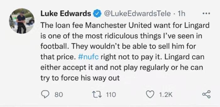 JRS直播网01月27日讯 ,记者LukeEdwards在社交媒体上表示林加德的租借费是其见过最荒唐的事情之一。