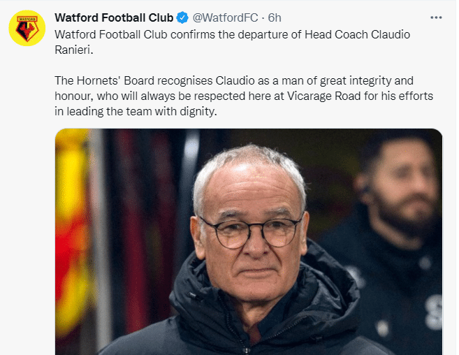 JRS直播网01月25日讯 据沃特福德官方消息,一线队主教练拉涅利下课。