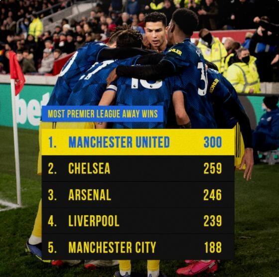 今天凌晨,曼联在英超联赛中客场3-1击败布伦特福德,成为英超历史上首支达成客场300胜的队伍。
