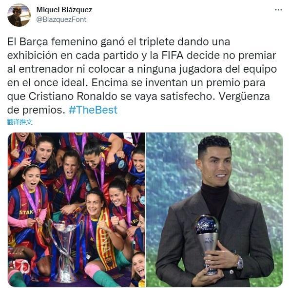 另一方面,C罗则拿到了男足特别奖,MiquelBlázquez炮轰道:“巴萨女足赢得了三冠王,国际足联却没有给她们颁发任何奖项。”