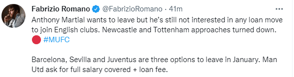马夏尔拒绝租借前往纽卡斯尔和热刺等英超球队。巴塞罗那、尤文图斯和塞维利亚都是他的潜在下家。他的周薪超过了20万英镑,曼联要求租借他的球队全额承担工资并支付租借费。